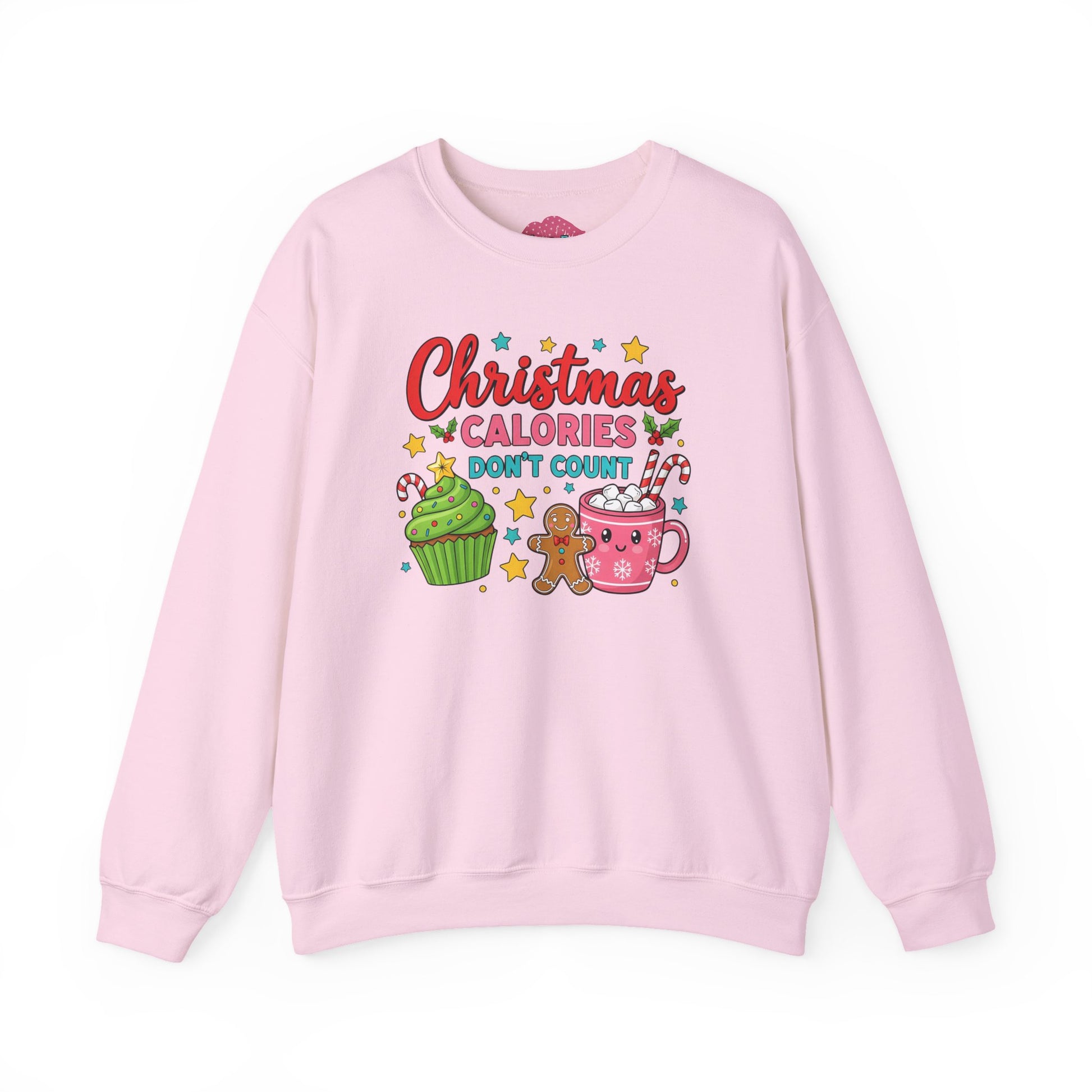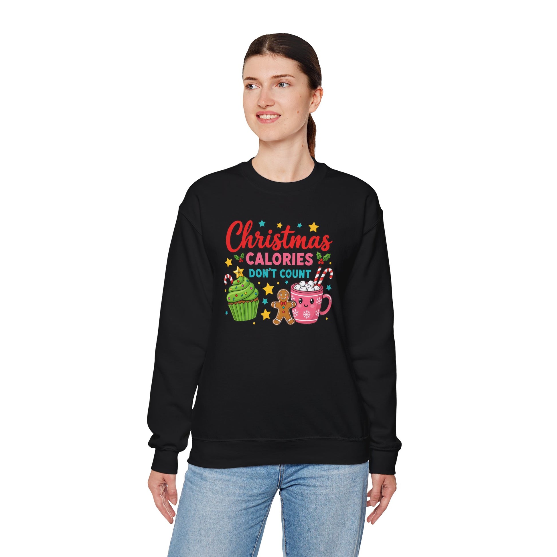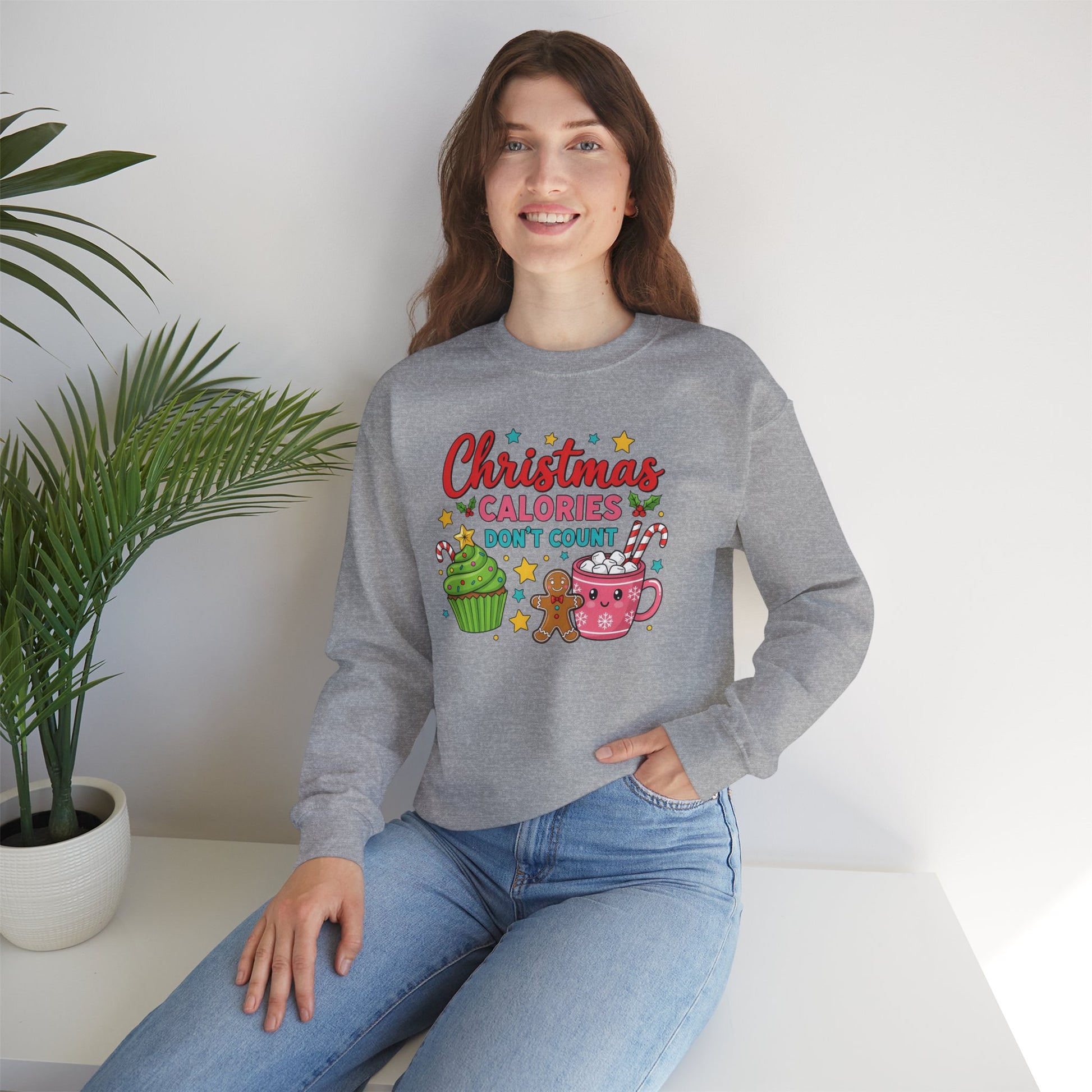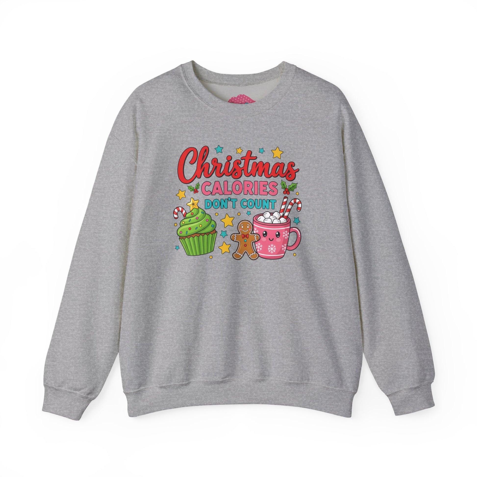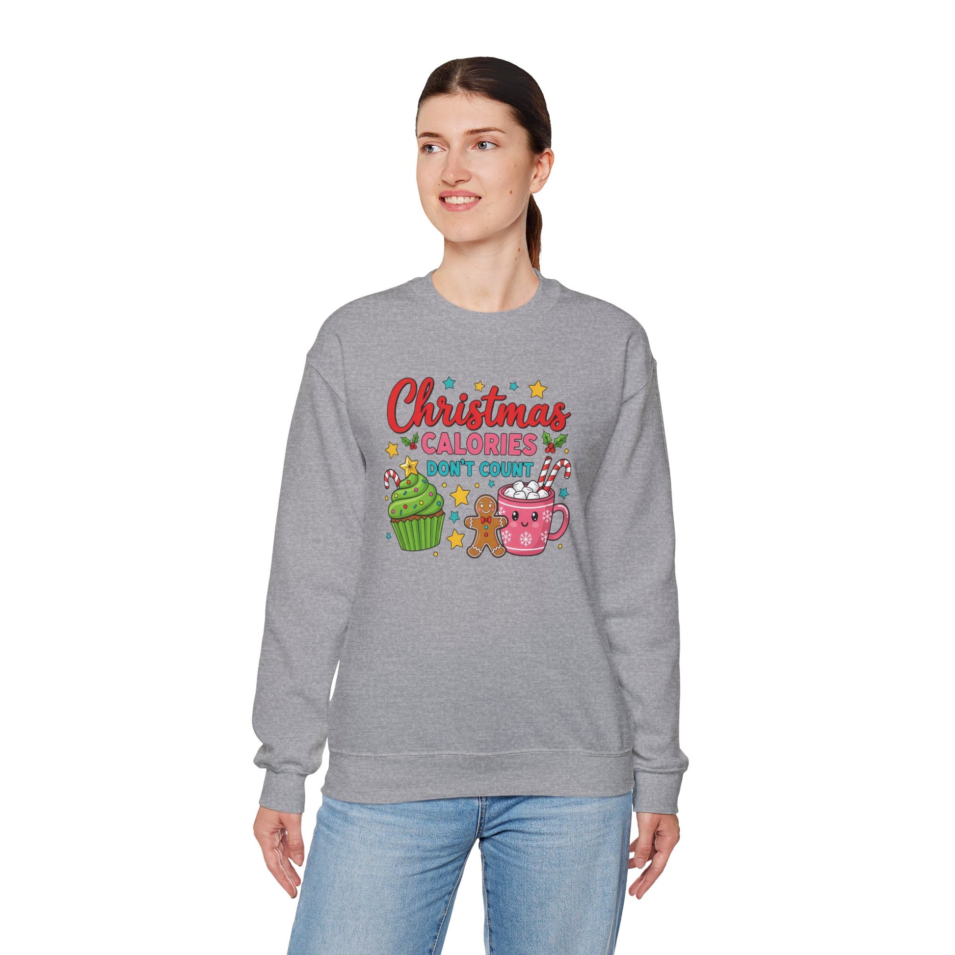 Soft, cozy, and cheerfully festive — this crewneck wraps you in warm holiday vibes while you savor the season. The graphic shows playful treats (cupcake, gingerbread, hot cocoa) with the whimsical line “Christmas calories don’t count,” adding a lighthearted wink to cookie swaps, tree-trimming nights, and slow mornings with a mug. The sweatshirt’s medium-heavy cotton/poly blend and classic crew silhouette make it an easy layer for brisk walks, movie marathons, or relaxed family gatherings. Durable double-needle stitching and a ribbed collar keep this piece looking neat through repeated wear, while tear-away neck labeling eliminates itch. Available with thoughtful printing and optional embroidery placements, it’s tailored to last and designed to feel like a familiar favorite from the first wear.