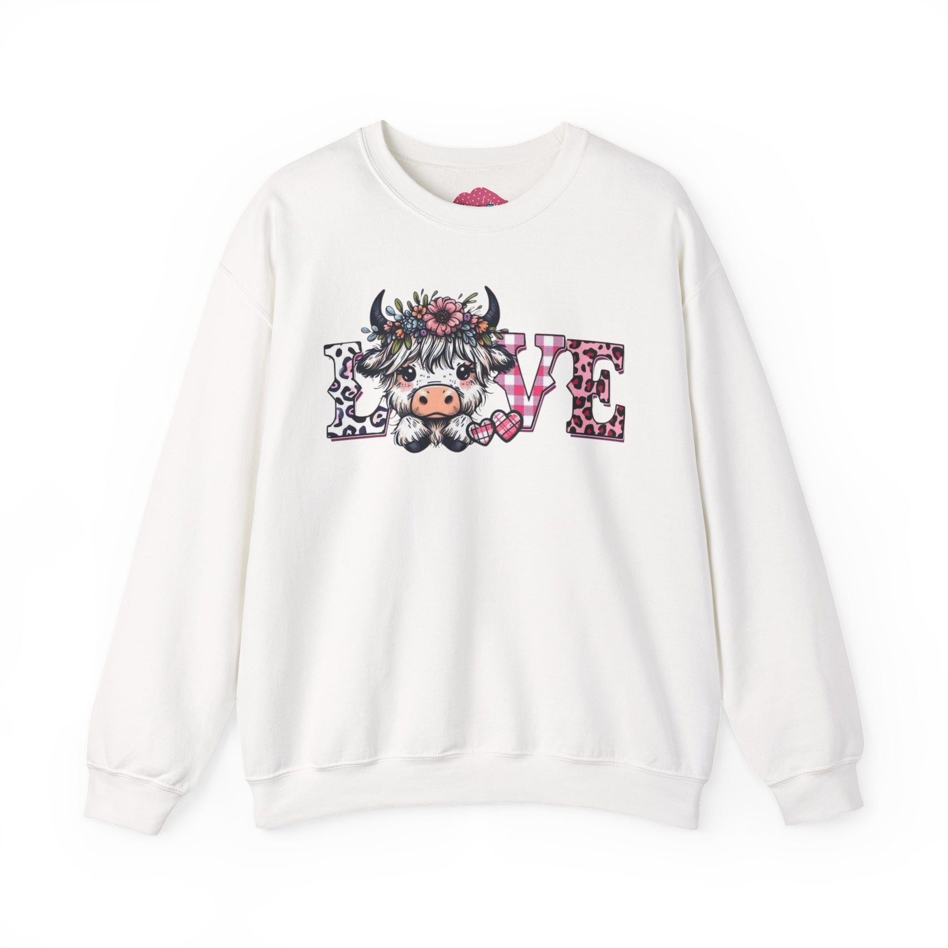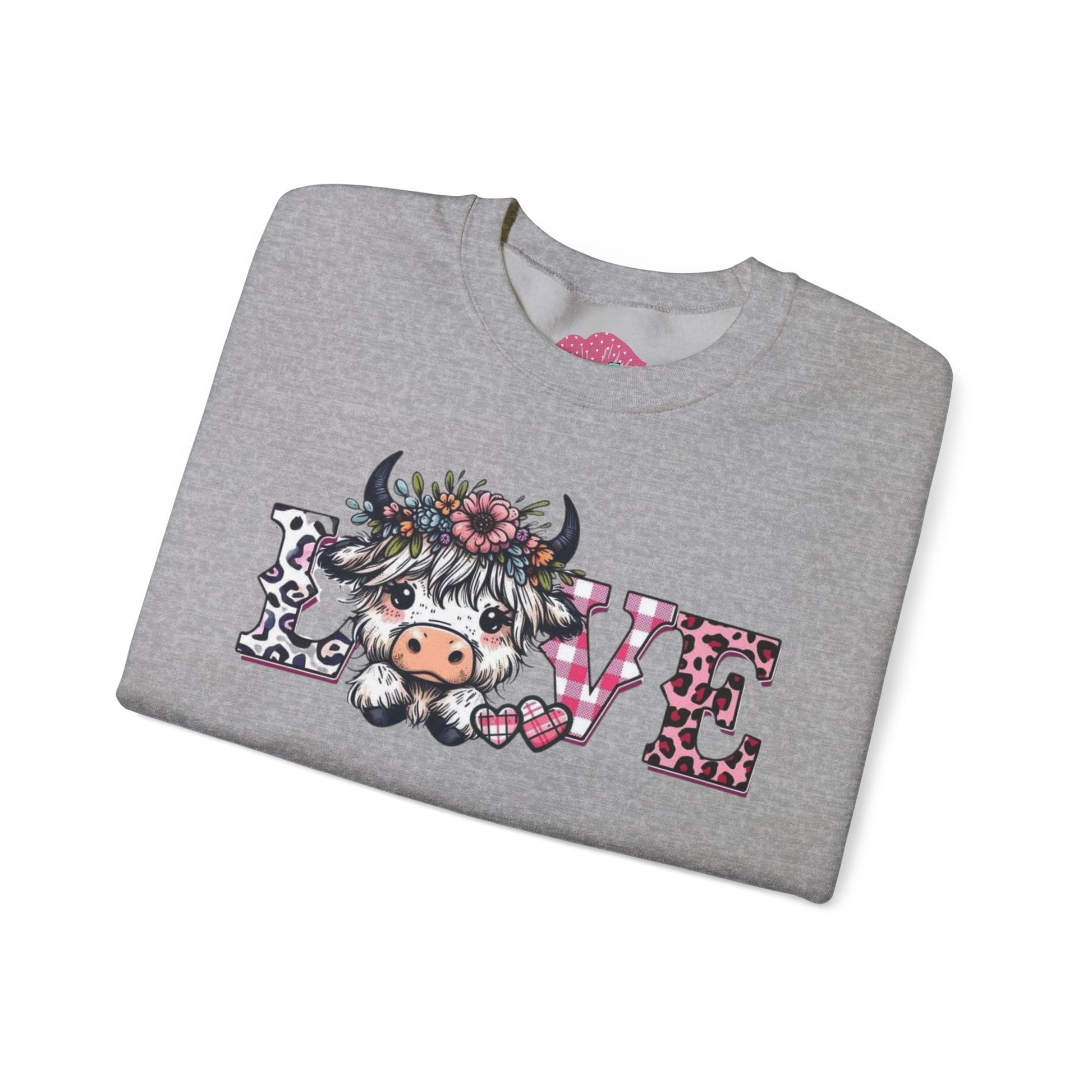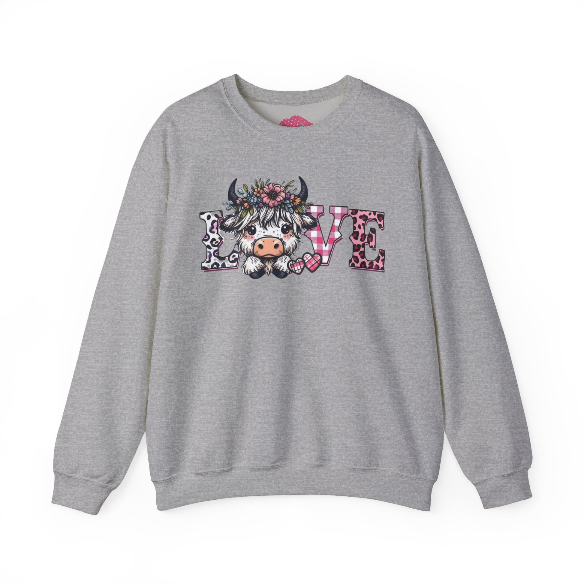 This soft, medium-weight crewneck brings a gentle, cozy vibe to everyday wear. The front features a whimsical “LOVE” design with a floral, cow-character motif that feels playful and heartfelt — like a warm hello from a countryside friend. The classic fit and ribbed crew collar create an easy, relaxed silhouette that layers well over shirts or under jackets. Built to hold up, the double-needle stitching and quality cotton-poly blend resist pilling while staying comfortable against skin. Subtle production details — tear-away neck label, OEKO-TEX dyes, and ethically sourced cotton — add thoughtful durability and conscience to a sweatshirt you’ll reach for again and again.