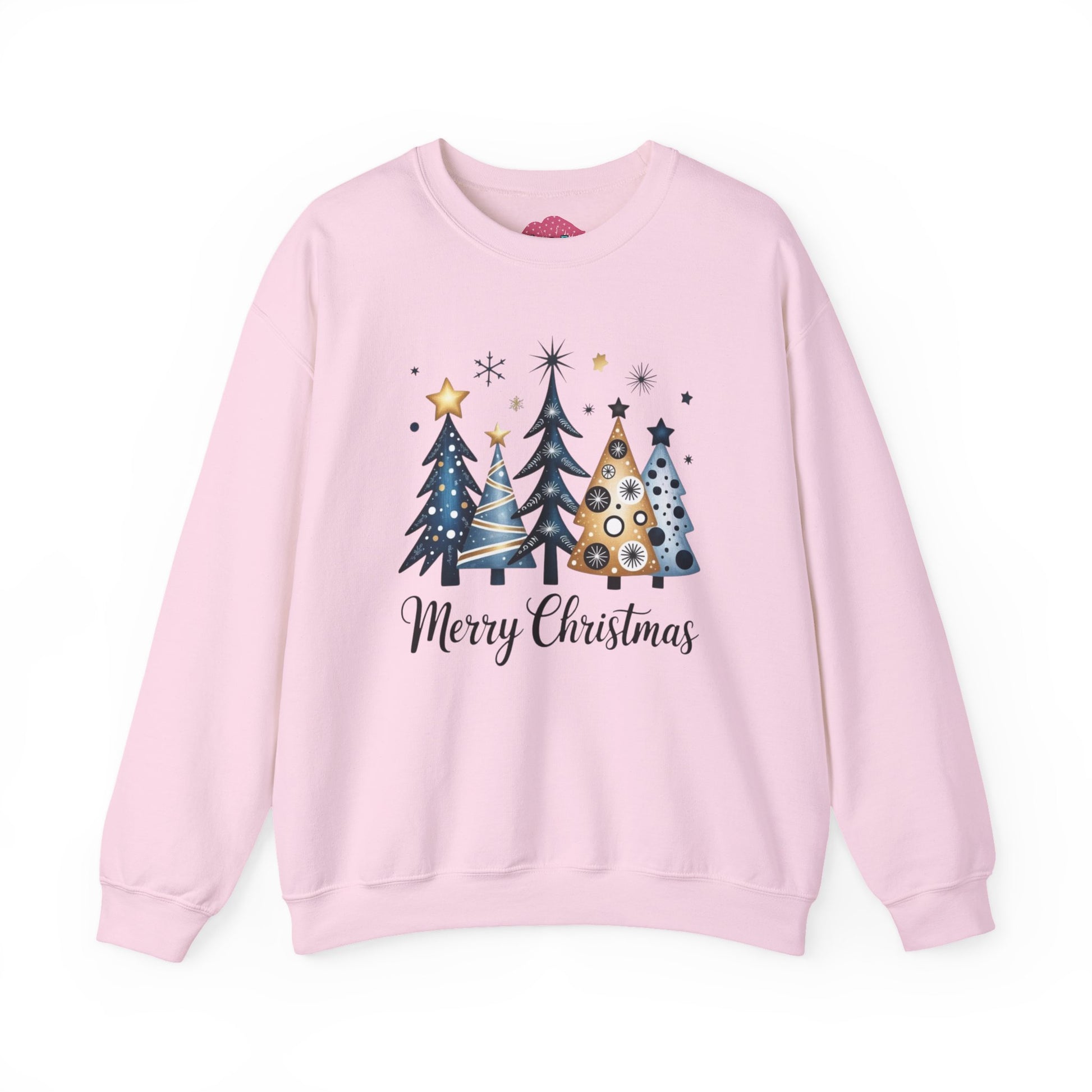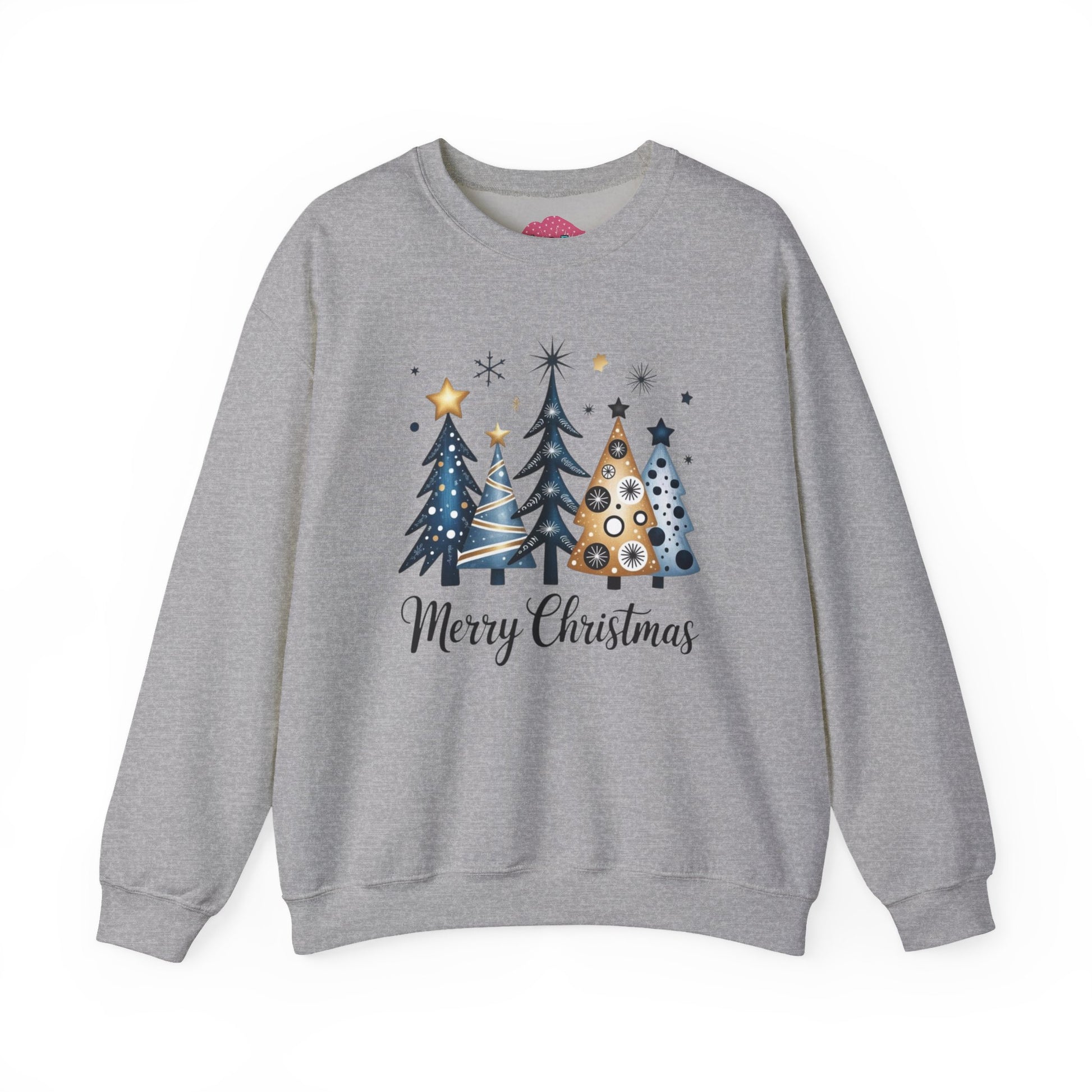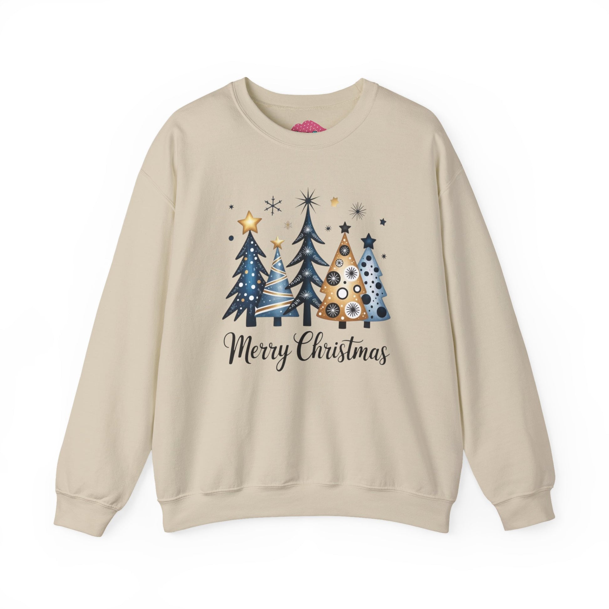 Soft, cozy, and quietly festive — this crewneck brings gentle holiday cheer without shouting. A row of stylized trees in muted navy and gold hues sits above a graceful “Merry Christmas” script, giving the sweatshirt a calm, modern feel. The medium-heavy cotton-poly blend holds shape and warmth while the crew neckline and classic fit make it easy to layer over shirts or tees. Subtle stitching and a tear-away label keep comfort high; choose embroidered accents at the chest or wrists for a handcrafted touch. Wear it on chilly evenings, at low-key family gatherings, or during slow morning coffee rituals by the tree.