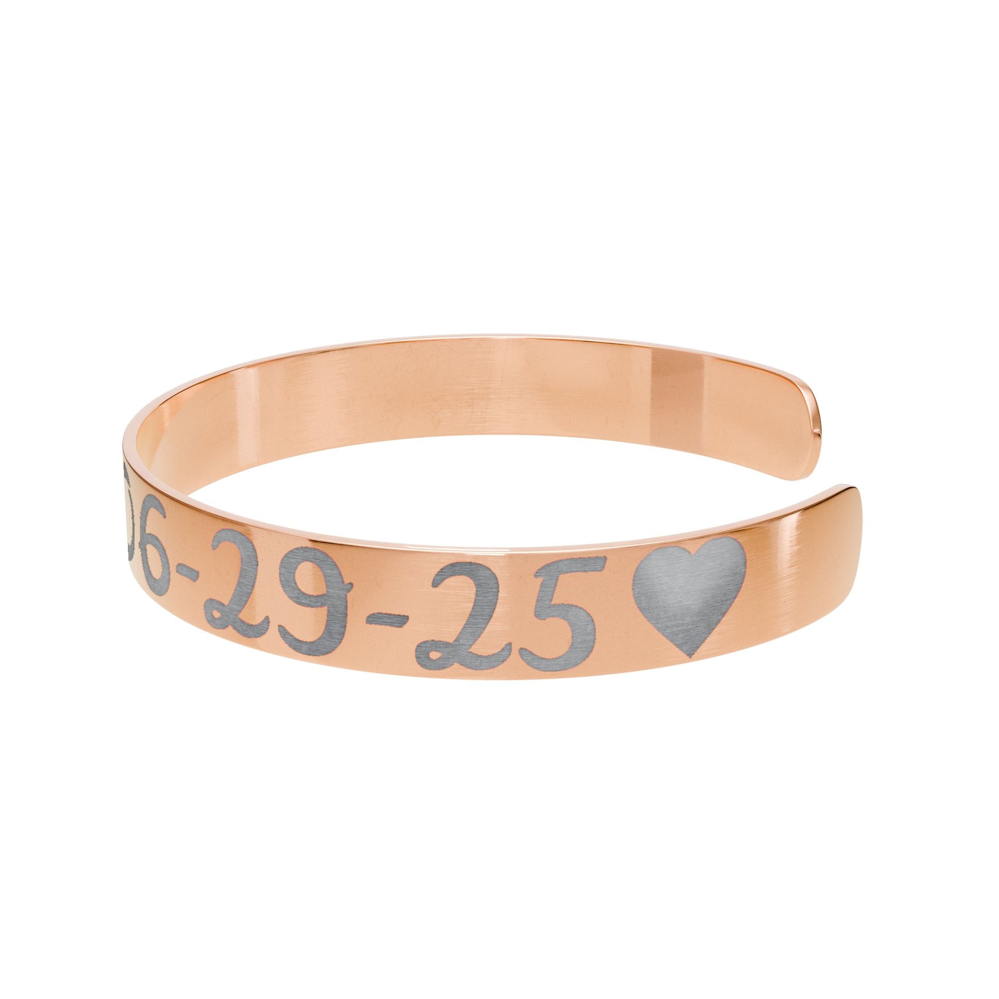 This engraved cuff carries a quiet, personal weight — a slim band of surgical-grade stainless steel shaped to sit comfortably on the wrist, engraved flat and then formed so your message remains crisp and wearable. The warm rose-gold PVD finish catches light without shouting, while the engraved letters and numbers pick up a subtle contrast that reads like a private note. It wears well every day and resists tarnish, safe for sensitive skin and packaged in a white gloss jewelry box with non-tarnish cotton fiber so it arrives ready to gift or keep. Slip it on with jeans and a cardigan or let it be the understated accent on a dressier night — it feels like a memory you can touch.