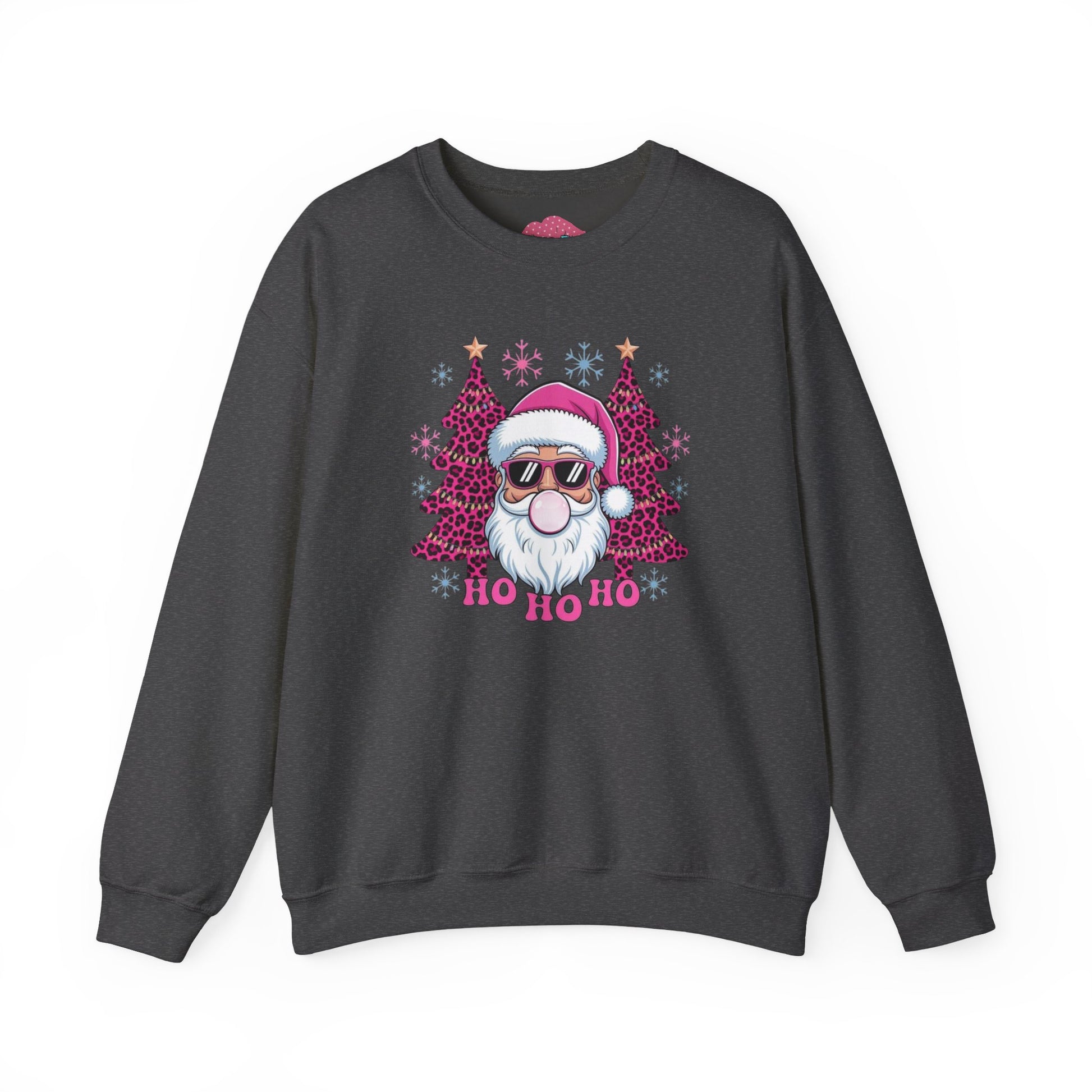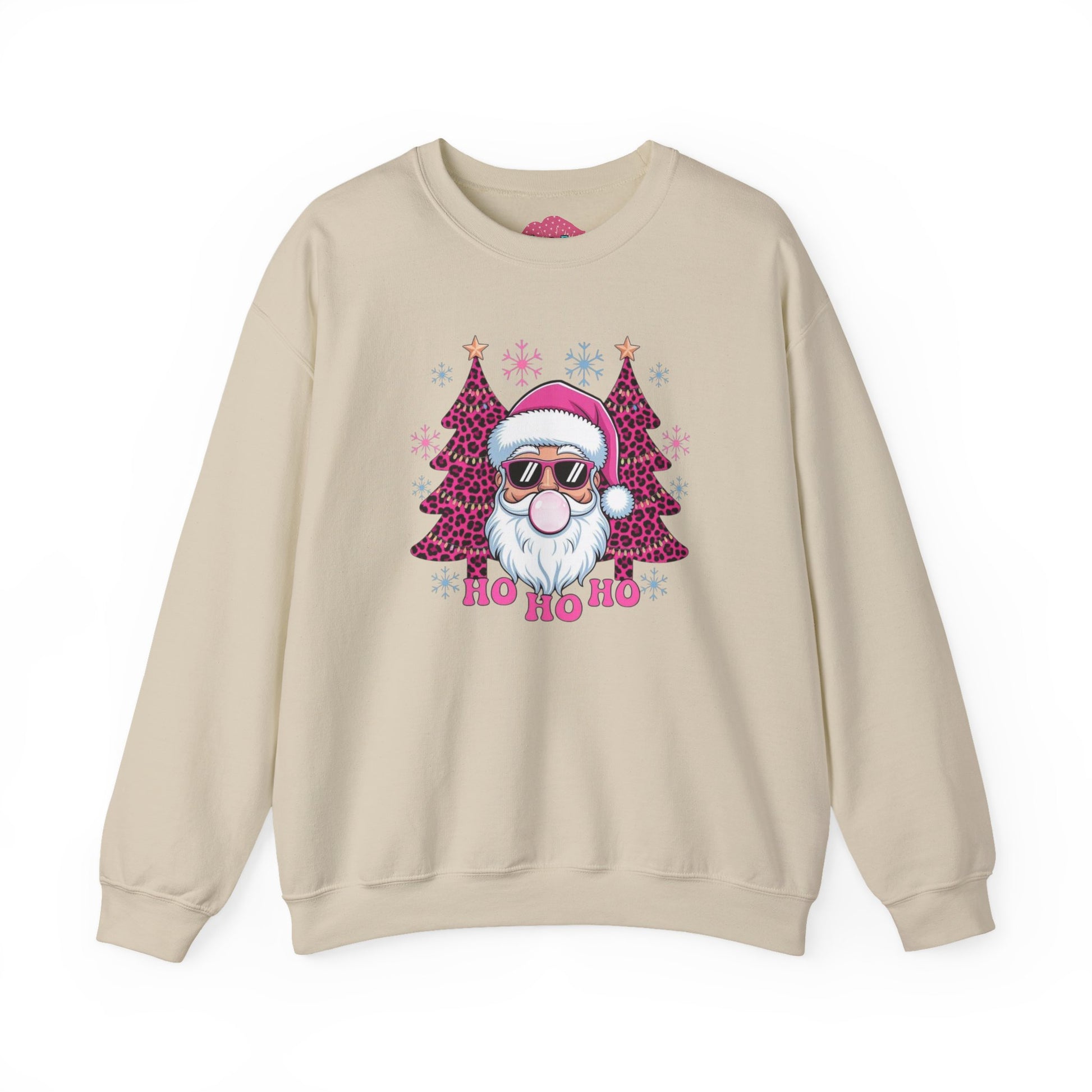 This cozy crewneck brings playful holiday spirit to your everyday wardrobe. A soft, medium-weight cotton-poly blend keeps warmth without bulk. The front features a fun, modern Santa illustration—sunglasses, rosy beard, and glittering pink trees—set above a cheeky “Ho Ho Ho” that feels both festive and fashion-forward. Clean ribbed cuffs and hem hold shape through washes, while double-needle stitching adds durability for seasons of wear. Subtle inner neck labeling and optional embroidery placement make it feel thoughtful and made-to-last. Wear it on chilly mornings, casual holiday meetups, or while wrapping gifts by the tree — it settles easily into relaxed, seasonal routines and adds a wink of personality to winter layers.