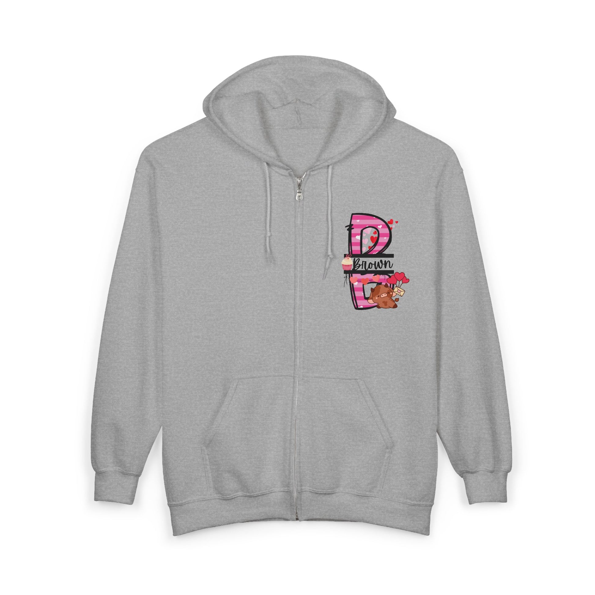 This cozy full-zip hoodie brings a playful, hand-drawn vibe to everyday wear. Soft medium-weight fabric and a roomy, classic cut make it feel like a warm hug on cooler days. The design features a cheerful, pink-accented name-style graphic with a sweet brown puppy and scattered hearts — an affectionate, slightly nostalgic motif that reads like a little declaration of love. Wear it around town, on relaxed weekend walks, or layered at home when you want something comfortable and a bit whimsical. The sturdy metal zipper, adjustable hood, and generous pockets make it practical, while the option for left-chest embroidery adds a subtle, personal touch.